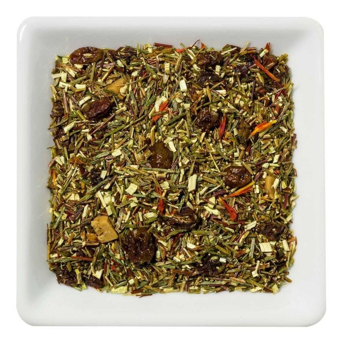 Ingrediënten: groene rooibos thee, duindoorn bessen (19%), macadamia noten (macadamia, suiker), aroma, saffloer bloemblaadjes.
