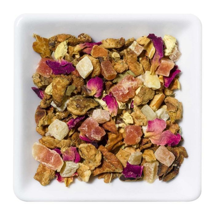 ngrediënten: Stukjes appel (53%), stukjes papaja (papaya, suiker, zuurteregelaar: citroenzuur), gember (10%), johannesbroodstukken, natuurlijk aroma, bessenbladeren (bessen-bladeren, zwarte bessenbladeren), rozenblaadjes