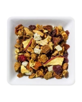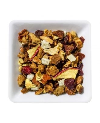Hibiscus, apple pieces, rosehip, cinnamon, almonds, pineapple (sugar, pineapple, antioxidant: citric acid), orange peel, flavoring, safflower blossoms, cornflower blossoms.