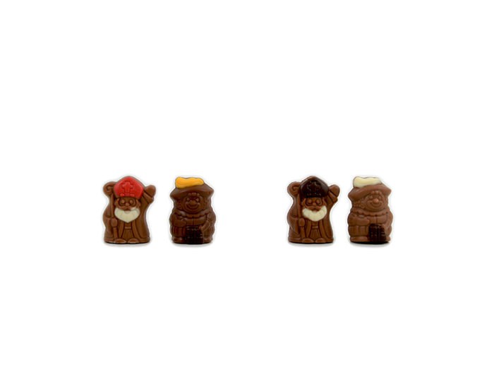 Een assortiment van Sinterklaas en zwarte Piet pralines (melk, wit en fondant) gevuld met praliné en vanille, pistache