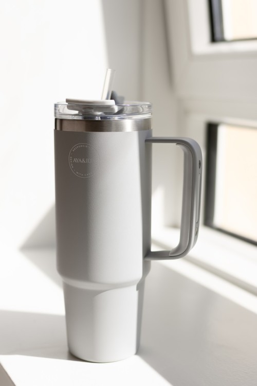 AYA&IDA THERMO CUP MET RIETJE, die 12 uur koud en 36 uur koud blijft met ijsblokjes, is een ruime to-go beker met rietje en handvat die zorgt voor uw vloeistofinname wanneer u onderweg bent. Drink water, sap, smoothies en andere koude dranken door het rietje in het deksel. Als u het voor warme dranken wilt gebruiken, gebruik dan de kleine opening in het deksel. Kleine truc: het deksel kan op 2 manieren worden vastgeschroefd, zodat zowel rechts- als linkshandigen van de beker kunnen genieten. AYA&IDA THERMO CUP MET RIETJE is gemaakt van eersteklas roestvrij staal 18/8, terwijl het deksel zelf is gemaakt van tritan. Het rietje is gemaakt van platina siliconen en alle materialen zijn vrij van schadelijke chemicaliën. De beker is laboratoriumgecertificeerd om te voldoen aan LFGB (food contact grade testing). De beker is vaatwasserbestendig.