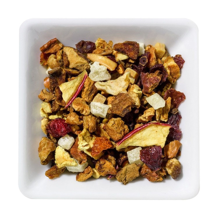 Ingrediënten: stukjes appel (44%), stukjes ananas (ananas, suiker, zuurteregelaar: citroenzuur), rozenbottelschillen, stukjes peer, karamel stukjes (suiker, gecondenseerde melk, glucosestroop, volle melkpoeder), aroma, citroenschillen, kaneel , appelschijfjes (1%), rode aalbessen. Kan sporen bevatten van soja, gluten en noten.