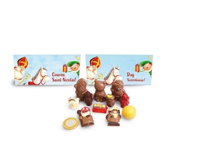 Luxe ballotin gevuld met crunch pralines, Sintjes modern, Sintjes & Pietjes, paardje, speculaas, mini figuren, marsepein, gouden cent, caraques