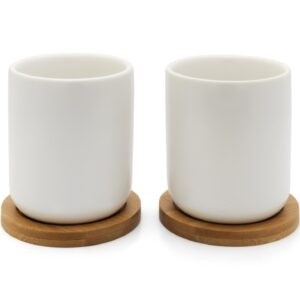 Deze set van Bredemeijer bestaat uit twee keramieken theemokken van 0,2L met 2 onderzetters in bamboe.