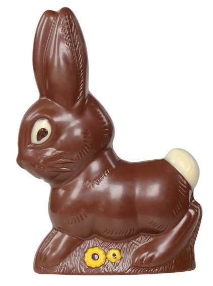 Deze haas is 18,5 cm hoog, weegt 150 gram en is gemaakt van Belgische Callebaut chocolade. in melk verkrijgbaar