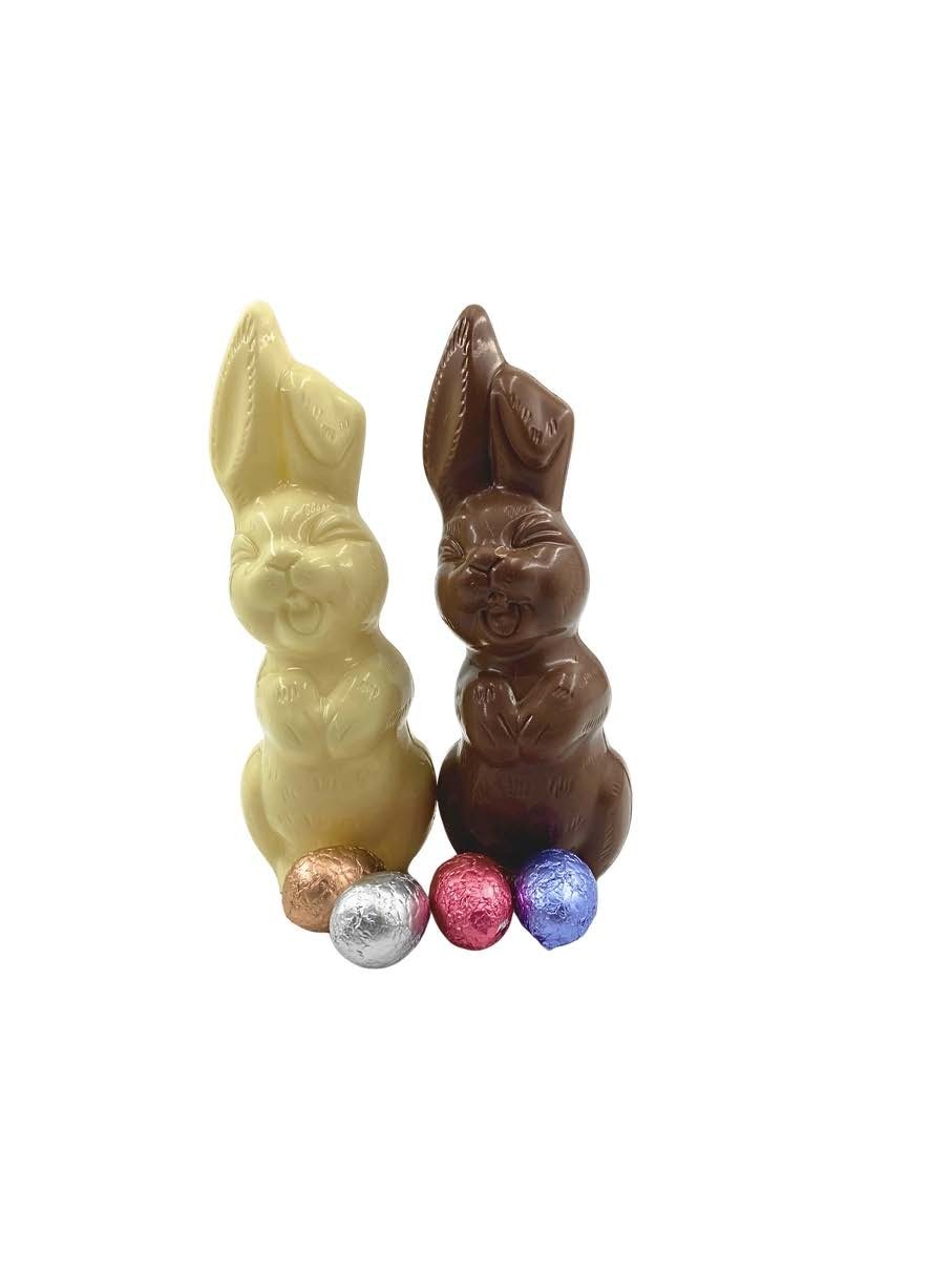 chocolade lachhaasjes (melk, wit of fondant chocolade ) - 17 cm - aangevuld 4 kleine gevulde eitjes.