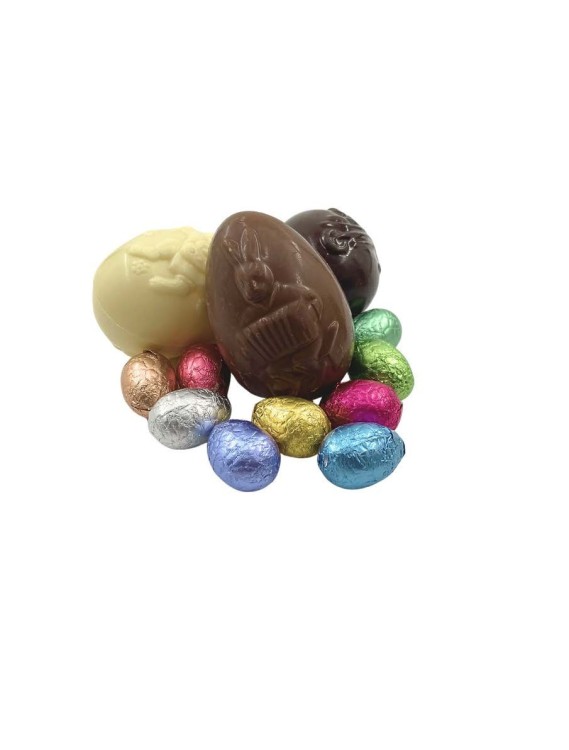Mika zakje gevuld met 3 grotere Callebaut chocolade eieren (melk, wit en fondant)