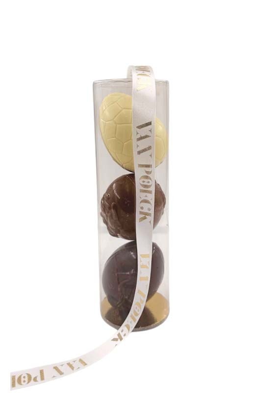 Een koker van 18 cm hoog gevuld met 3 Callebaut chocolade paaseieren