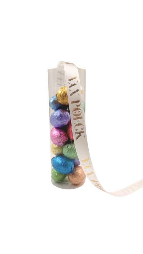 en koker van 15 cm hoogte gevuld met 15 kleine gevulde paaseitjes naar keuze