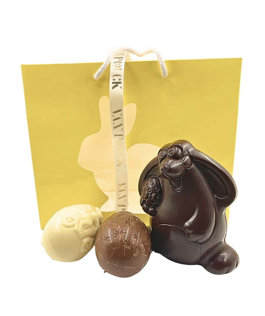 ingevuld met een Callebaut chocolade hangoorkonijn van 13 cm (verkrijgbaar in melk, fondant of witte chocolade), en 2 grote chocolade paaseieren