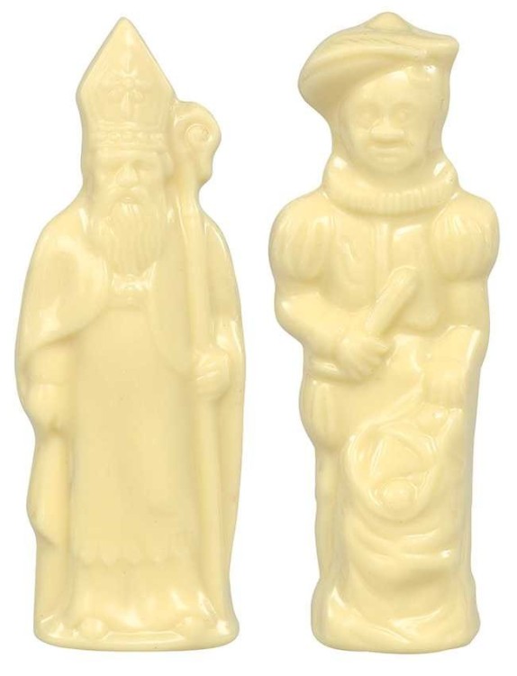Een mika zakje met een Sinterklaas en zwarte piet in echte Callebaut chocolade- elk een gewicht van 50 gr en 14 cm groot. (ook verkrijgbaar in een mix van melk, witte of fondant chocolade).