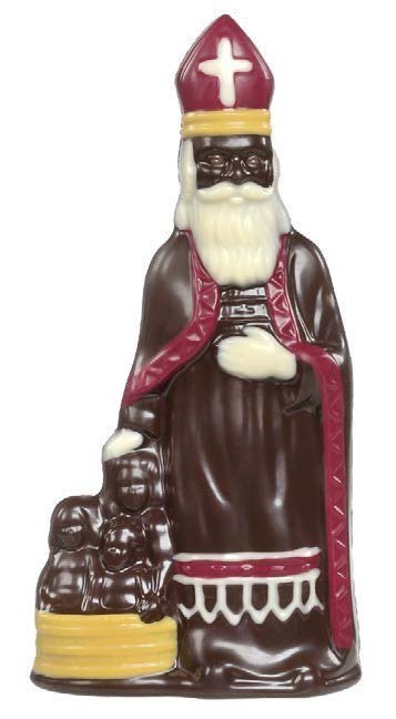 Een gedecoreerde chocolade - Callebaut - Sinterklaas met 3 kinderen van 20 cm hoog en een gewicht van 125 gr.