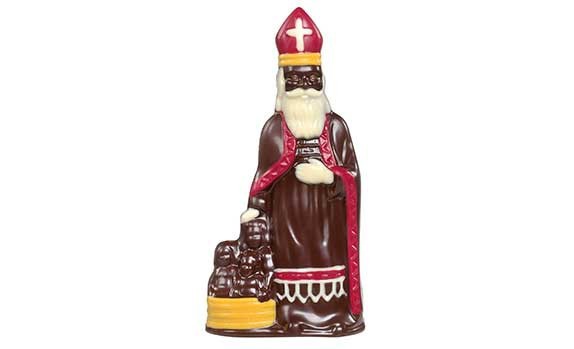 Een gedecoreerde chocolade - Callebaut - Sinterklaas met 3 kinderen van 25 cm hoog en een gewicht van 250 gr.