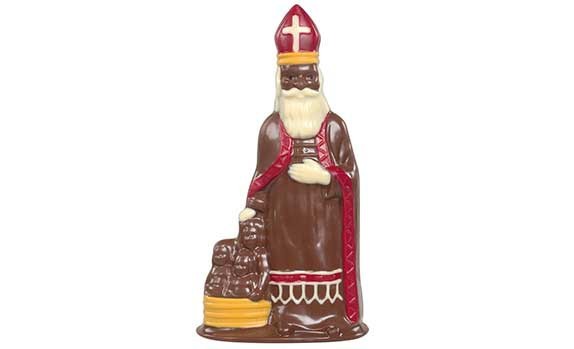 Een gedecoreerde chocolade - Callebaut - Sinterklaas met 3 kinderen van 25 cm hoog en een gewicht van 250 gr.