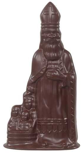 Een chocolade - Callebaut - Sinterklaas met 3 kinderen van 15 cm hoog en een gewicht van 60 gr. Verkrijgbaar in melk, witte of fondant chocolade. Mooi, luxueus ingepakt.