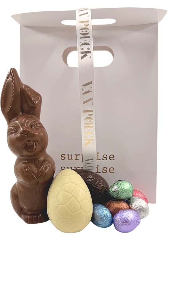 Geschenkzakje met een hoogte van 25 cm ingevuld met een Callebaut chocolade kleine lachhaas,