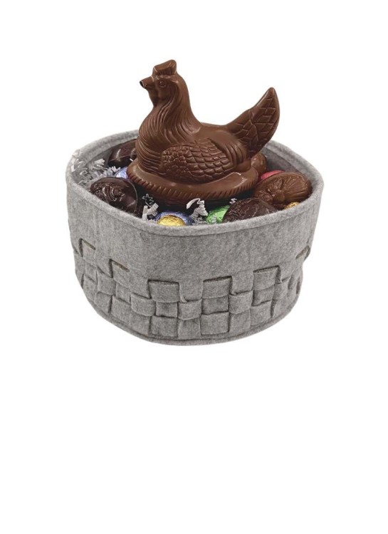 Vilten mand met een Callebaut chocolade kip van 13 cm- 120 gr - aangevuld met 5 Callebaut chocolade eieren en 9 kleine gevulde eitjes.