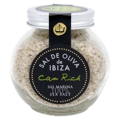 "Can Rich Ibiza Olive Salt" (Sal de Oliva de Ibiza) is a product made by the Can Rich winery on the island of Ibiza, Spain. It consists of 100% natural sea salt from the Ses Salines nature reserve, which is then macerated with local Ibiza olives, producing an artisan, 100% handmade, and unrefined salt with a unique flavor profile.