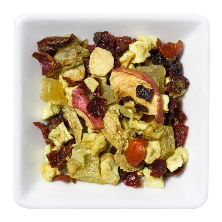 Ingrediënten: Gember stukjes (gember, suiker) (24%), rozenbottel schillen, ananas stukjes (ananas, suiker, citroenzuur (acidifier)), mango stukjes (mango, suiker, citroenzuur (acidifier)), appelstukjes, gember (4% ), appelschijfjes, witte hibiscus, natuurlijk gember extract (2%).