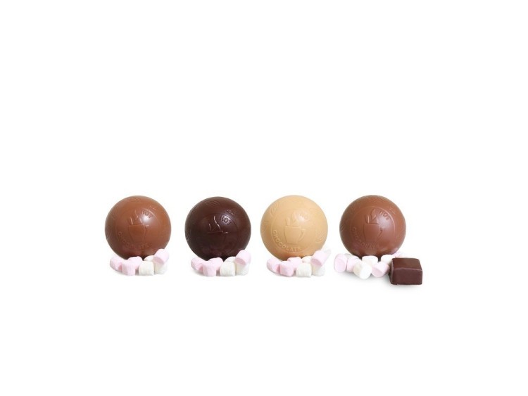 Chocolade bol gevuld met marshmallow, speciaal voor het bereiden van warme chocolademelk. Doe de bom in een tas en giet er warme melk over, de chocolade smelt en de marshmallows komen tevoorschijn.