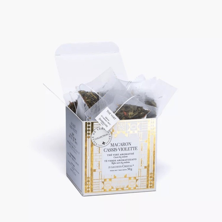 Net zo fris en bloemig als de felbegeerde taart, combineert deze melange met succes de frisheid van een groene thee met de aroma’s van zwarte bessen, viooltjes en ‘bitterkoekjes’. Een paar stukjes ananas en bloemblaadjes maken hem onweerstaanbaar.