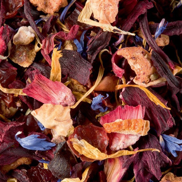 Ingrediënten: hibiscus en rozebottel, stukjes appel en appelsien,zonnebloemblaadjes, aroma van mango en exotisch fruit.