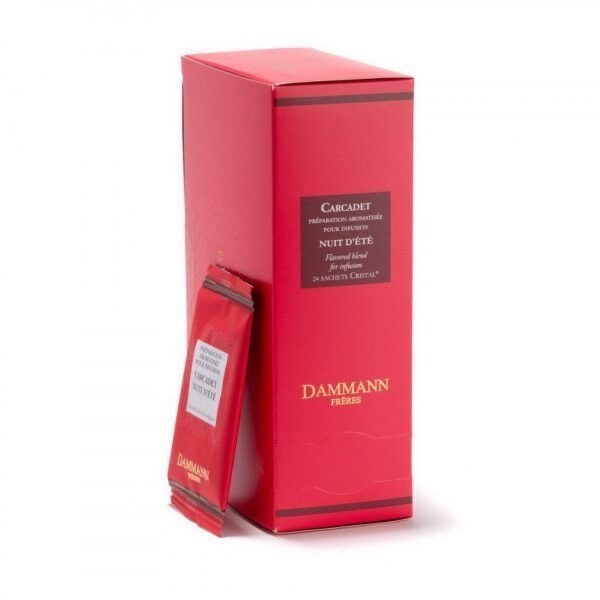 Dominante : rode vruchten – Carcadet fruitinfuus – Mengeling hibiscus, stukjes appel, rozebottel, aroma frambozen, aardbei en room. De theevariëteiten en infusies van het merk Dammann Frères zijn goed gekozen mengelingen met een subtiel aroma. In West-Afrika wordt carcadet ook wel 'bissap' genoemd. Het is een infusie van hibiscusbloesem die u warm of koud kunt drinken. De Carcadet Nuit d’Été in Cristal-zakjes (zakjes van ragfijn nylon waarin alle aroma's goed bewaard blijven) is een infusie van hibiscusbloesem, appelstukjes, rozenbottelschillen en aroma's van rood fruit
