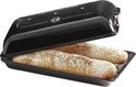 Met de ciabatta vorm van het merk Emile Henry, bak je een overheerlijk "traditioneel" Italiaans ciabatta brood! Dit mediterrane brood in landelijke stijl, voor echte olijfolieverslaafden, is geliefd door zijn zachte en taaie binnenkant en licht knapperige korst. Ciabatta brood is gemaakt van mager en zeer vloeibaar deeg dat een unieke vochtige textuur geeft, een taaie binnenkant en een unieke smaak. Dankzij de 2 holtes van de ciabatta baker zijn de broden (tot 250 gram ieder) goed gevormd, wat resulteert in gelijkmatige plakjes, maar ook is het brood hierdoor geschikt voor het maken van sandwiches. Het koepelvormige deksel helpt de luchtvochtigheid te regelen en zorgt voor een licht knapperige korst, terwijl de binnenkant vochtig en luchtig blijft. De diepe groeven in de baker zijn geschikt voor ander deeg, zoals glutenvrij deeg. De openingen aan de uiteinden van het deksel zorgen ervoor dat de baker eenvoudig te openen is.