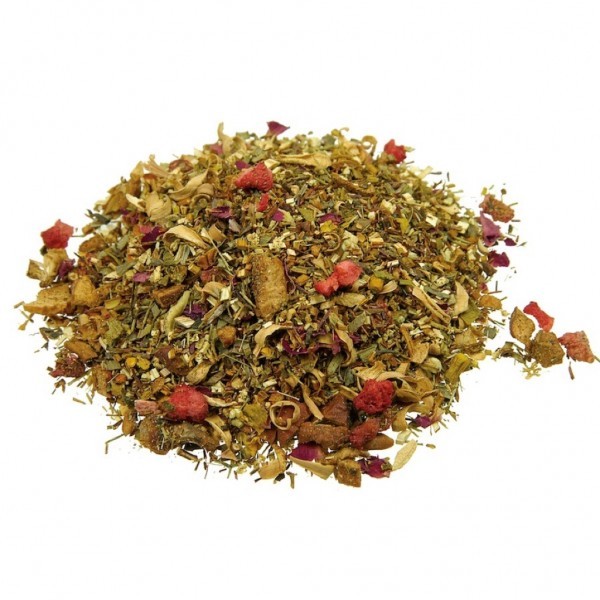 Kruideninfusie met groene rooibos, gember, kardamon, kaneel, verveine, camille, lavendel, rozenknop, perzik.
