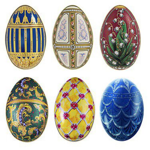 Prachtige tinnen Fabergé eieren met verschillende motieven.