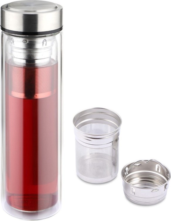 Voor iedereen die de hele dag wel kan blijven genieten van een heerlijk kopje thee is er deze dubbelwandige fles met theefilter. De fles is ideaal omdat deze ook gebruikt kan worden voor vers gearomatiseerd water of ijsthee. Deze fles met theefilter van Weis heeft een modern design met drijvend effect van de drankjes om de smaken optimaal te beleven. Deze dubbelwandige fles met verwijderbare filter heeft een afmeting van: diameter 7 cm en hoogte 25.5 cm. De fles heeft een hoge isolatiecapaciteit dankzij dubbelwandig ontwerp en is voorzien van een lekvrije siliconen afdichting in de deksel. Na gebruik kan deze eenvoudig worden gereinigd in de vaatwasmachine.