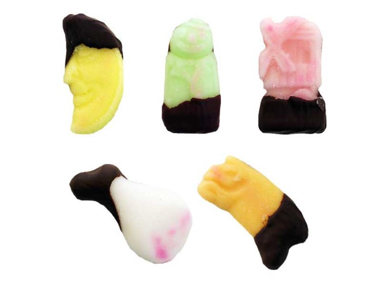 Assortiment fondant suikertjes in verschillende vormen en kleuren met chocolade voet.
