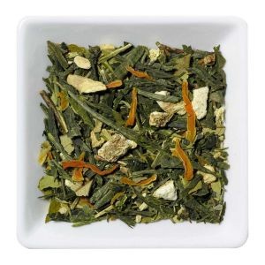 Natuurlijk gearomatiseerde mengeling van groene thee en specerijen. Zachte sencha gecombineerd met frisse citrusschillen, citroenmirte en kruidige gember, afgerond met elegante kaneel en fijne reepjes wortel. Afkomstig van gecontroleerde biologische teelt.