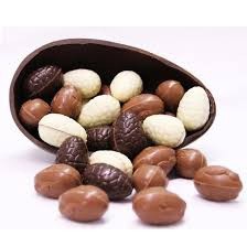 Een prachtig gevuld chocolade ei met een assortiment van kleine paaseitjes.