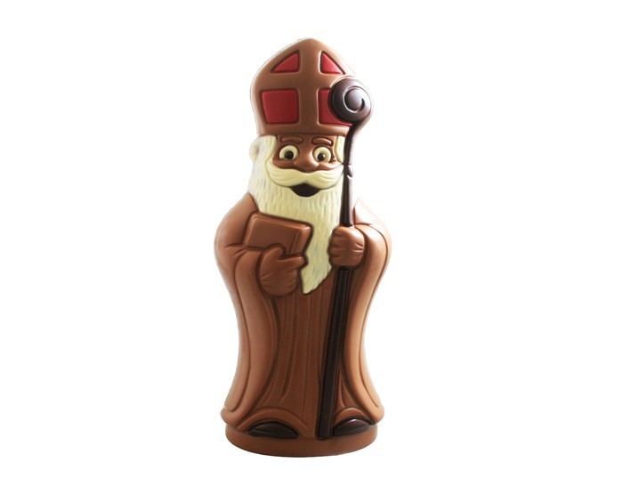 Grote Sinterklaas van 50 cm groot. Met de hand ingekleurd. Enkel in melkchocolade verkrijgbaar.