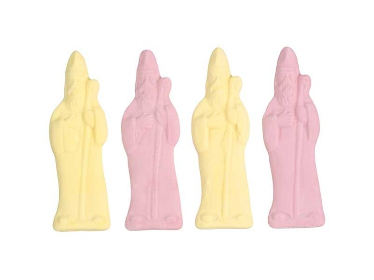 De guimauve snoepjes in de vorm van Sinterklaas (12cm). Mix van 2 kleuren en smaken van zachte snoep: een echte klassieker.