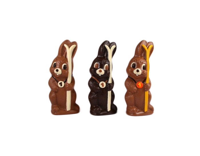 Haas met ski van 23 cm groot in fondant chocolade.