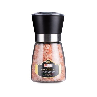 Himalaya zout met zwarte truffel in een handige kruidenmolen
