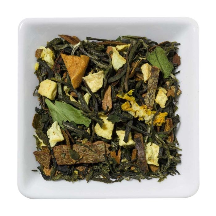 Gearomatiseerde witte thee met appel en kaneel. De fijne Mao Feng en Pai Mu Tan "witte thee basis" is verfijnd met fruitige appel stukjes en bekroond door de smaak van appel brandy en heerlijke kaneel.