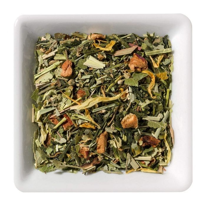 Een unieke en originele blend van groene rooibos met appel linde, citroengras, duidoornbes, meidoorn, verbena, heide, rozeknop, korenbloem, foliumzuur biotine. Vitamine CB1 B2 B12