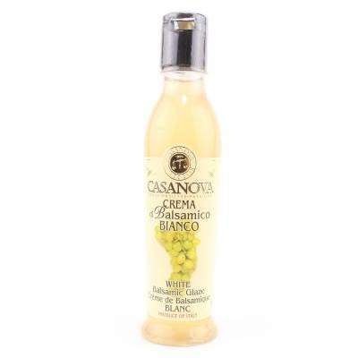 Balsamico crema wit wordt geproduceerd met typische Modenese druivenmost, geconcentreerd en gemengd met een gerijpte balsamico: het belangrijkste kenmerk is de hoge dikte en de grote kookveelzijdigheid.