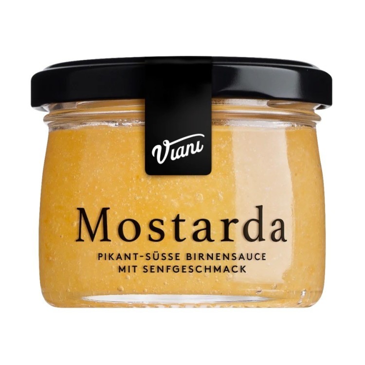 Viani mostarda peren pikant is een Italiaanse perensaus met de scherpe smaak van mosterd, ideaal als begeleiding bij kazen, gekookt vlees, charcuterie en gevogelte. Het combineert de zachte, zoete smaak van peer met een pittige mosterdkick, waardoor het een complex smaakprofiel heeft dat goed past bij zowel zachte als harde kazen en rijke vleesgerechten.