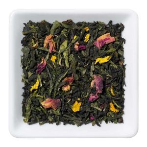 Chinese groene Sencha, rijk aan smaak dankzij een pallet van aroma’s van passievrucht, wijnperzik en bosaardbei. Verrijkt met stukjes gedroogd fruit en versierd met veelkleurige korenbloemblaadjes.