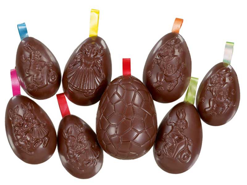 De leukste chocolade paaseieren met bolletjes en een lintje om op te hangen.Afhankelijk van de grootte mag u rekenen op 2/3 paaseieren per 100 gr.
