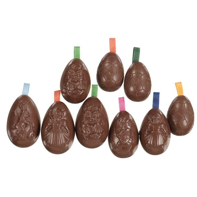 De leukste chocolade paaseieren met bolletjes en een lintje om op te hangen.