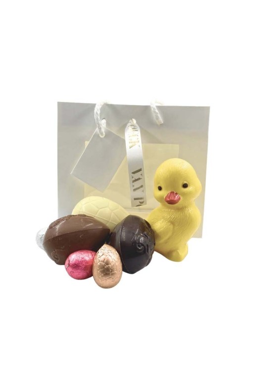 Wit cadeautasje met venster van 16*14cm ingevuld met een Callebaut chocolade kuiken (verkrijgbaar in witte, fondant, melk of geel ingekleurde chocolade) en aangevuld met 3 chocolade eieren en 4 kleine gevulde eitjes.