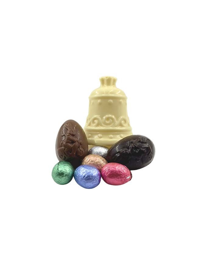 Callebaut chocolade klok - 60 gr (verkrijgbaar in melk witte of fondant chocolade) aangevuld met 4 kleine gevulde eitjes en é Paaseieren.