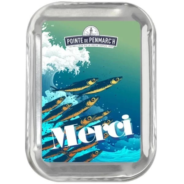 Wilt u een sardienenliefhebber bedanken? Hier is iets om hem blij te maken: een blikje sardienen in olijfolie versierd met een vliegende vis en het woord ‘Merci’. Als hij een verzamelaar is, kan hij het bewaren, en als hij een fijnproever is, kan hij genieten van de inhoud: heerlijke, smeltende sardienen, op verantwoorde wijze gevangen.