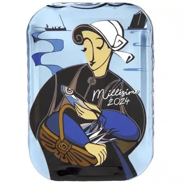 Genestelde sardientjes vers van het visseizoen, op de ouderwetse manier gemaakt en ingeblikt in Douarnenez, waar ze 4 maanden zijn bewaard om ze te laten rijpen in hun extra vierge olijfolie. Dit blikje is het resultaat van een samenwerking met de kunstenares Flore Betty. Ze gebruikt collage en gemengde technieken, waarbij ze gips, pastel, acryl en olieverf mengt. Ze verbeeldt en onderzoekt graag het hele scala aan menselijke gevoelens.
