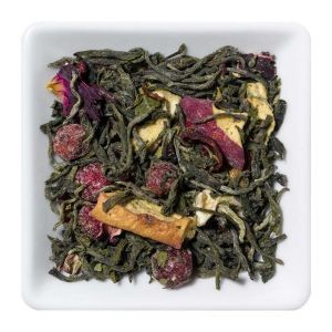 Een mengeling van wiite en groene thee met stukjes anans, citronelle, griottes, aardbei, rabarber, peer.